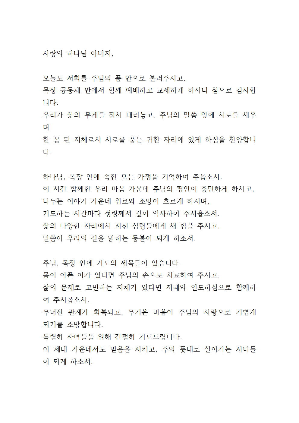 목장 가족 간에 따뜻함, 현실적 어려움, 신앙적 소망을 함께 담아 기도하면 좋을 거예요.