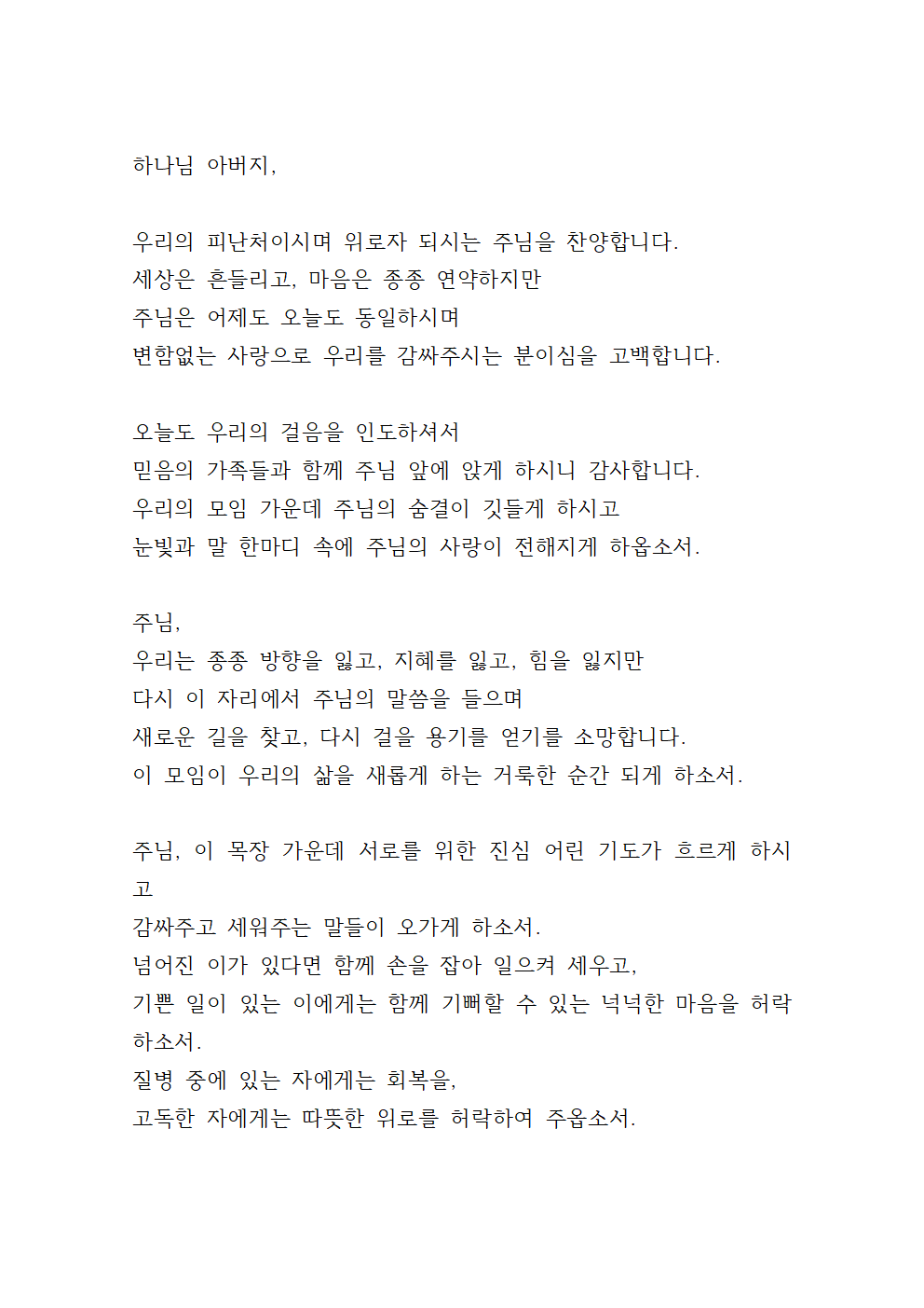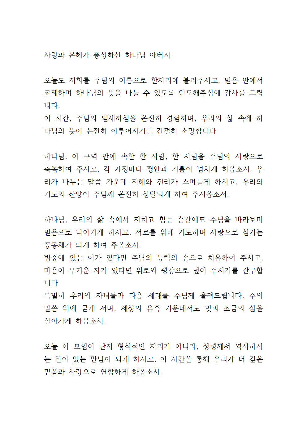오늘도 우리를 부르셔서 한 마음으로 이 자리에 모이게 하신 은혜에 감사드립니다.