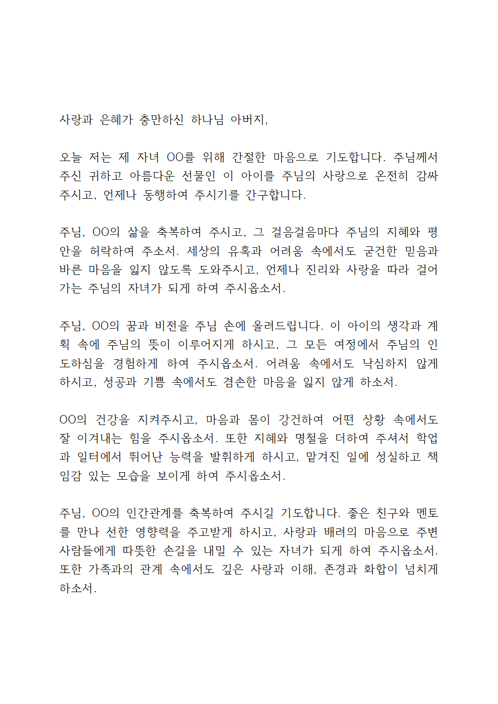 하나님 아버지, OO의 앞날을 주님께 온전히 맡겨드립니다. 이 아이가 어디에 있든지, 무엇을 하든지 주님의 사랑과 은혜에서 벗어나지 않게 하시고, 언제나 믿음 안에서 성장하며 선한 영향력을 끼치는 사람으로 살아가게 하옵소서.