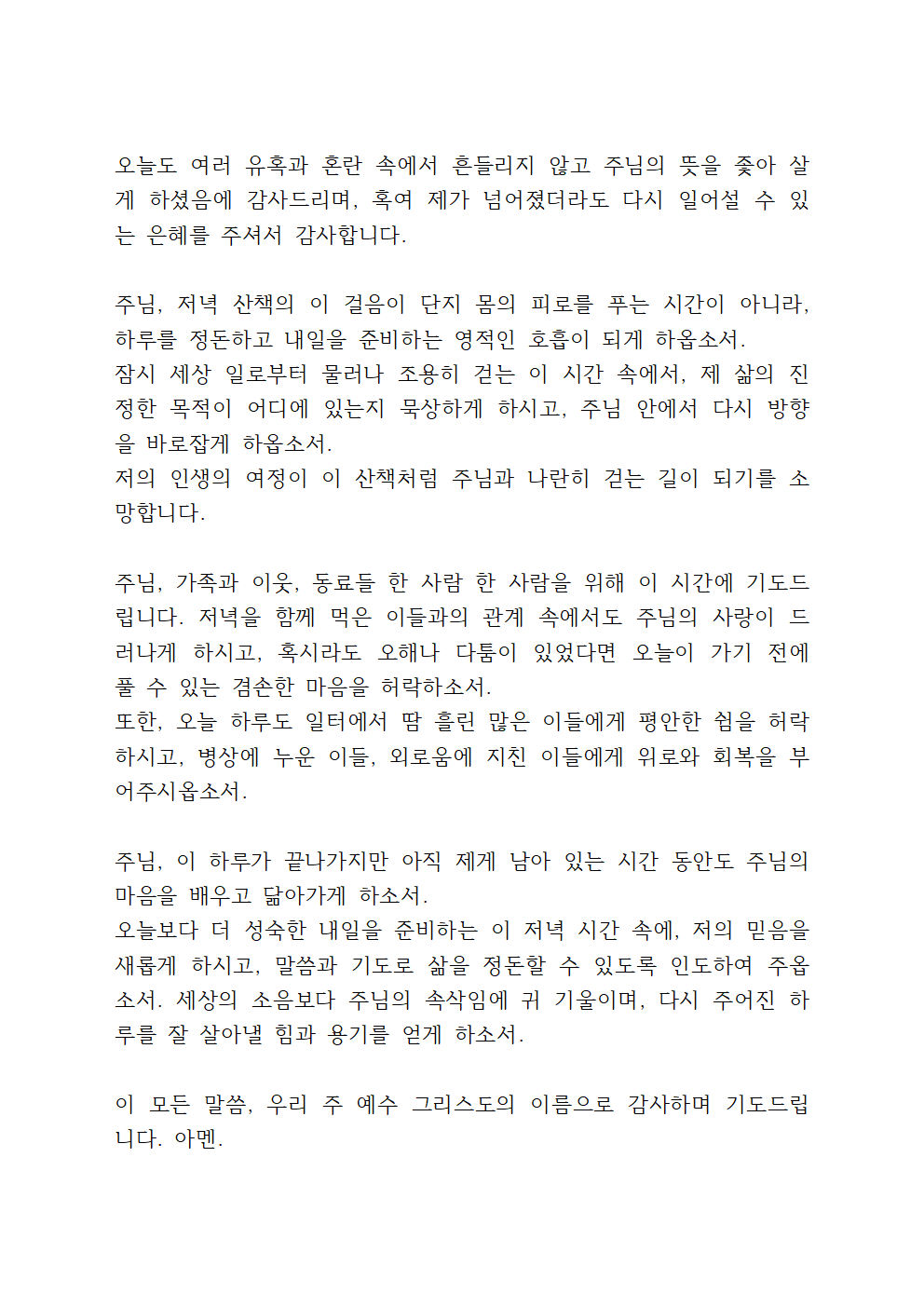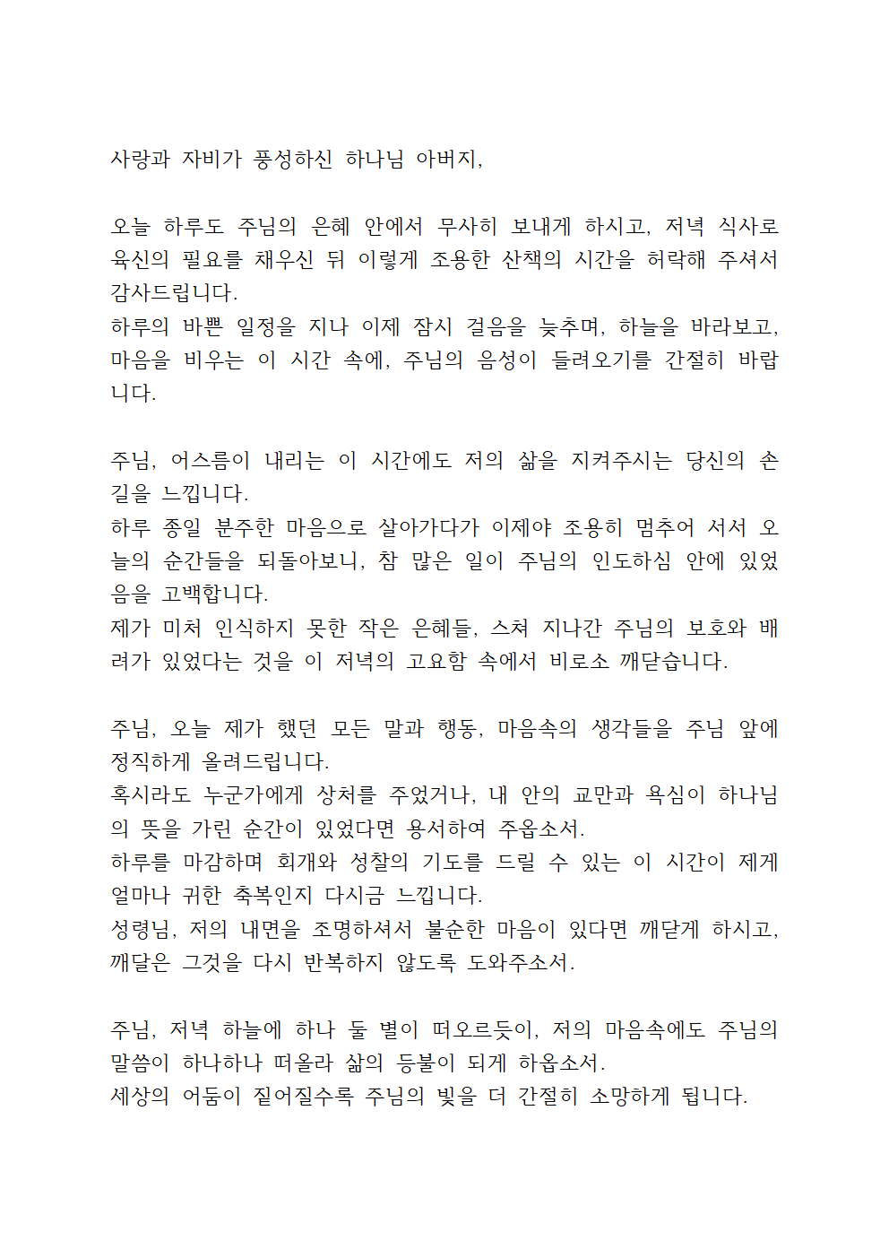 주님, 저녁 산책의 이 걸음이 단지 몸의 피로를 푸는 시간이 아니라, 하루를 정돈하고 내일을 준비하는 영적인 호흡이 되게 하옵소서. 잠시 세상 일로부터 물러나 조용히 걷는 이 시간 속에서, 제 삶의 진정한 목적이 어디에 있는지 묵상하게 하시고, 주님 안에서 다시 방향을 바로잡게 하옵소서. 저의 인생의 여정이 이 산책처럼 주님과 나란히 걷는 길이 되기를 소망합니다.