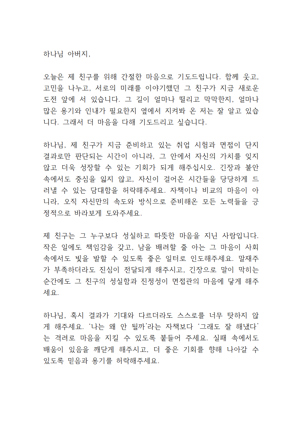 제 친구는 그 누구보다 성실하고 따뜻한 마음을 지닌 사람입니다. 작은 일에도 책임감을 갖고, 남을 배려할 줄 아는 그 마음이 사회 속에서도 빛을 발할 수 있도록 좋은 일터로 인도해 주세요. 말재주가 부족하더라도 진심이 전달되게 해 주시고, 긴장으로 말이 막히는 순간에도 그 친구의 성실함과 진정성이 면접관의 마음에 닿게 해 주세요.
