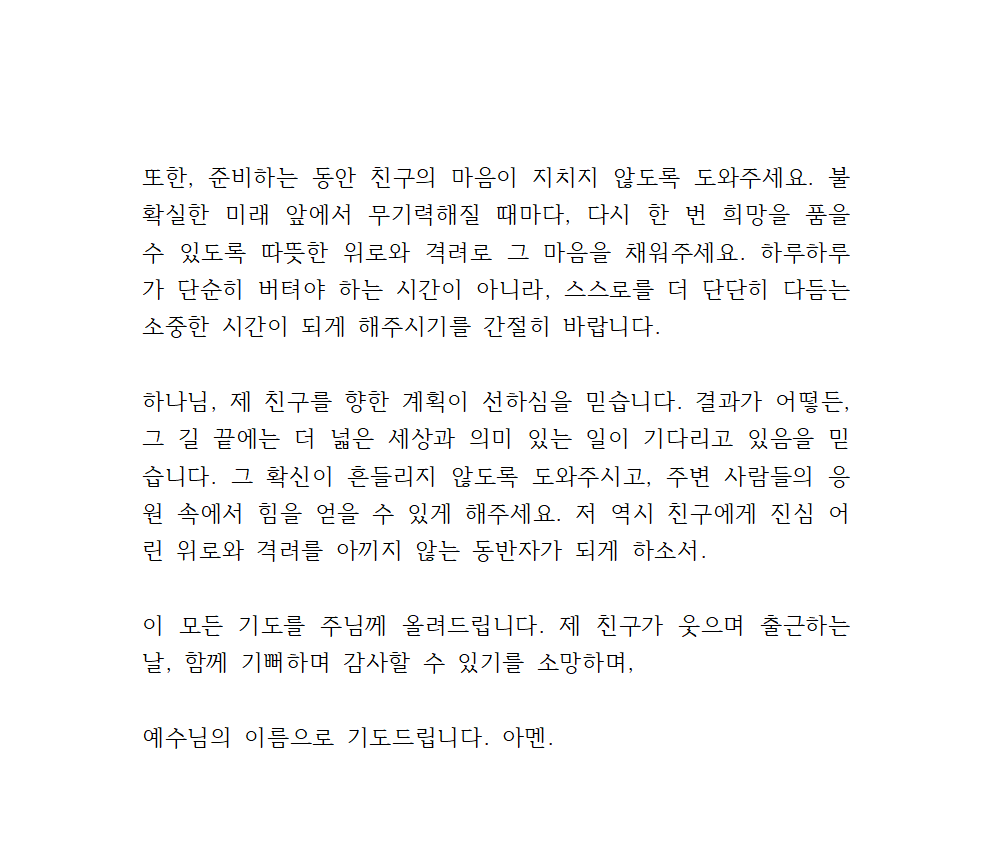 또한, 준비하는 동안 친구의 마음이 지치지 않도록 도와주세요. 불확실한 미래 앞에서 무기력해질 때마다, 다시 한 번 희망을 품을 수 있도록 따뜻한 위로와 격려로 그 마음을 채워주세요. 하루하루가 단순히 버텨야 하는 시간이 아니라, 스스로를 더 단단히 다듬는 소중한 시간이 되게 해 주시기를 간절히 바랍니다.