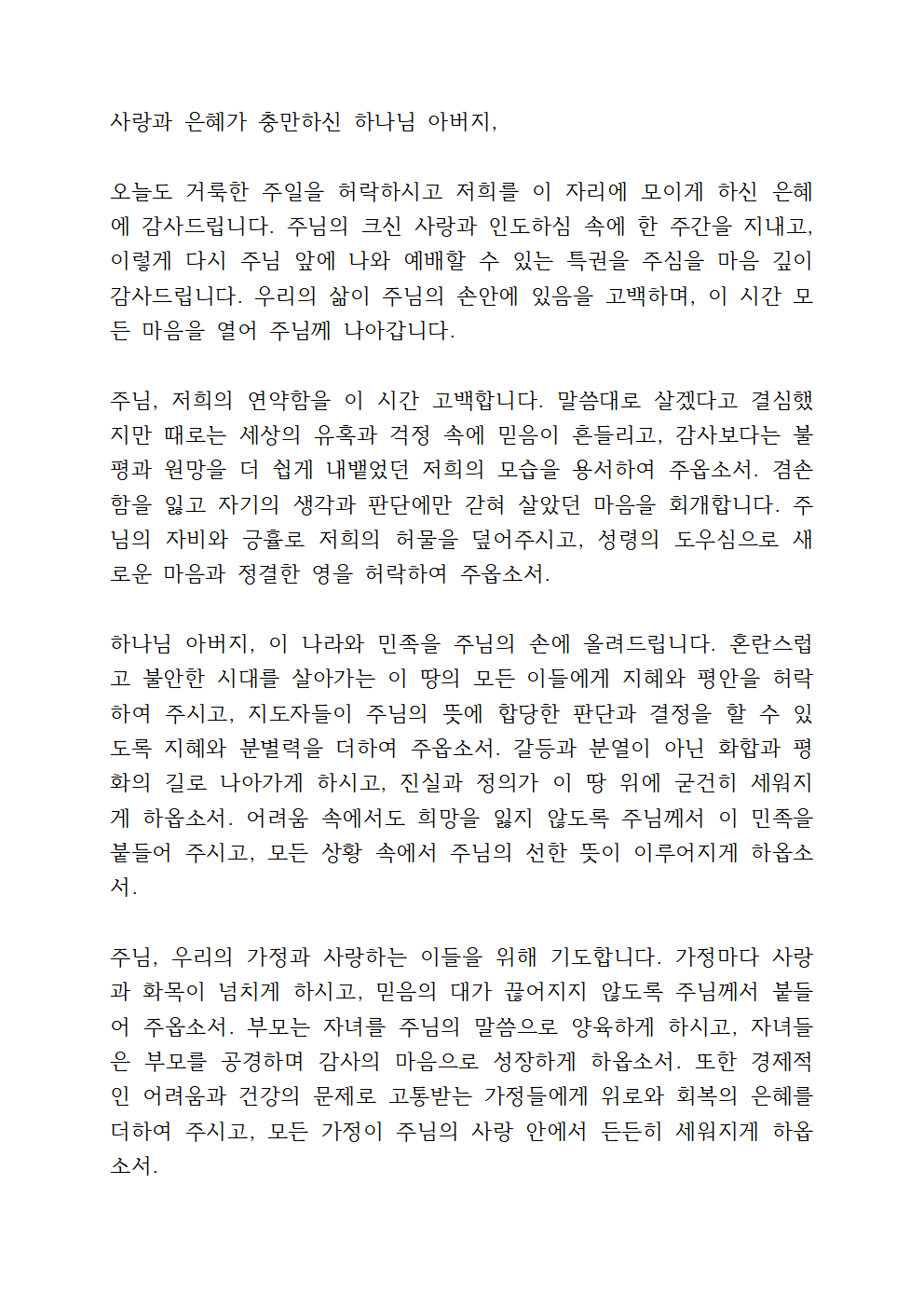 오늘도 거룩한 주일을 허락하시고 저희를 이 자리에 모이게 하신 은혜에 감사드립니다. 주님의 크신 사랑과 인도하심 속에 한 주간을 지내고, 이렇게 다시 주님 앞에 나와 예배할 수 있는 특권을 주심을 마음 깊이 감사드립니다. 우리의 삶이 주님의 손안에 있음을 고백하며, 이 시간 모든 마음을 열어 주님께 나아갑니다.
