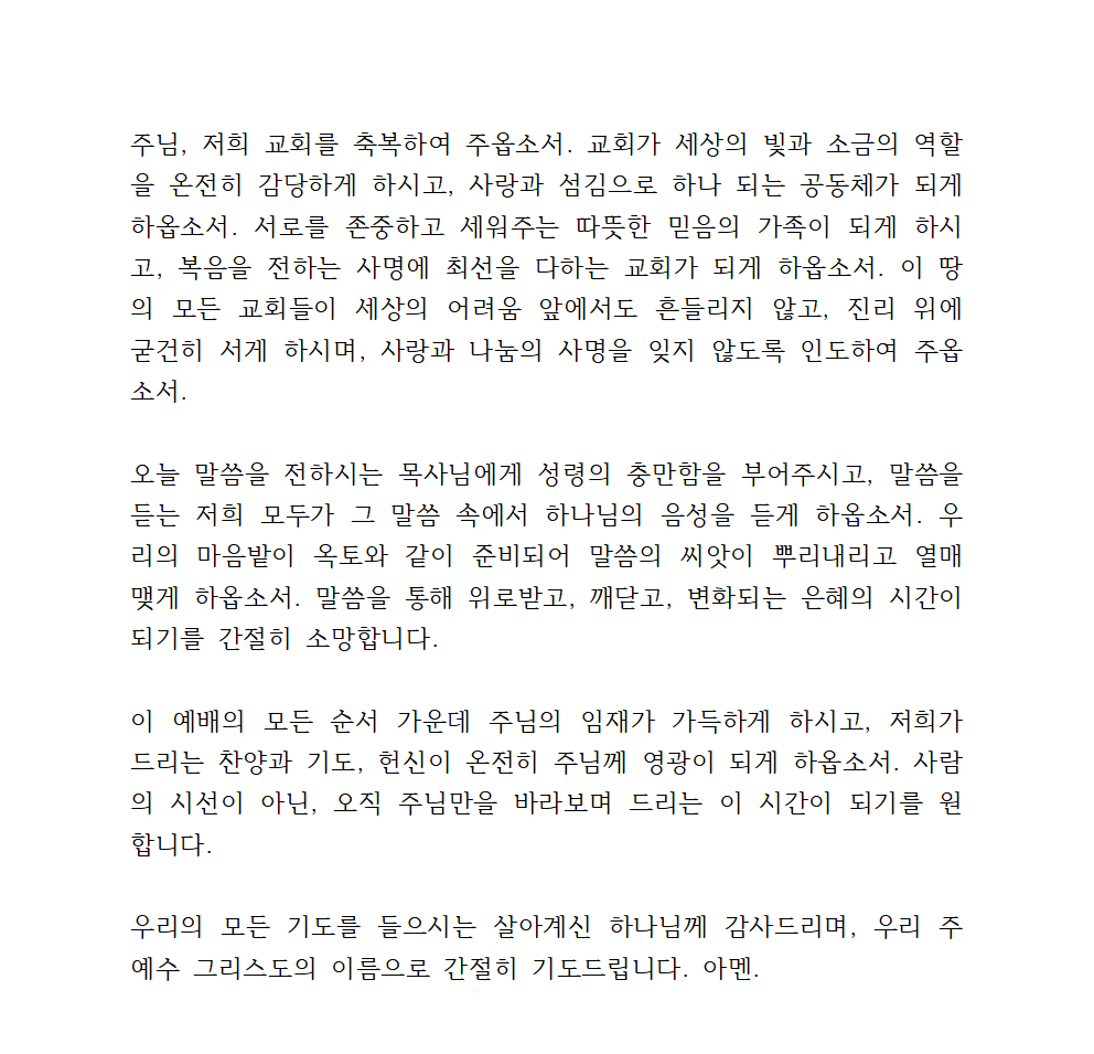 오늘 말씀을 전하시는 목사님에게 성령의 충만함을 부어주시고, 말씀을 듣는 저희 모두가 그 말씀 속에서 하나님의 음성을 듣게 하옵소서. 우리의 마음밭이 옥토와 같이 준비되어 말씀의 씨앗이 뿌리내리고 열매 맺게 하옵소서. 말씀을 통해 위로받고, 깨닫고, 변화되는 은혜의 시간이 되기를 간절히 소망합니다.