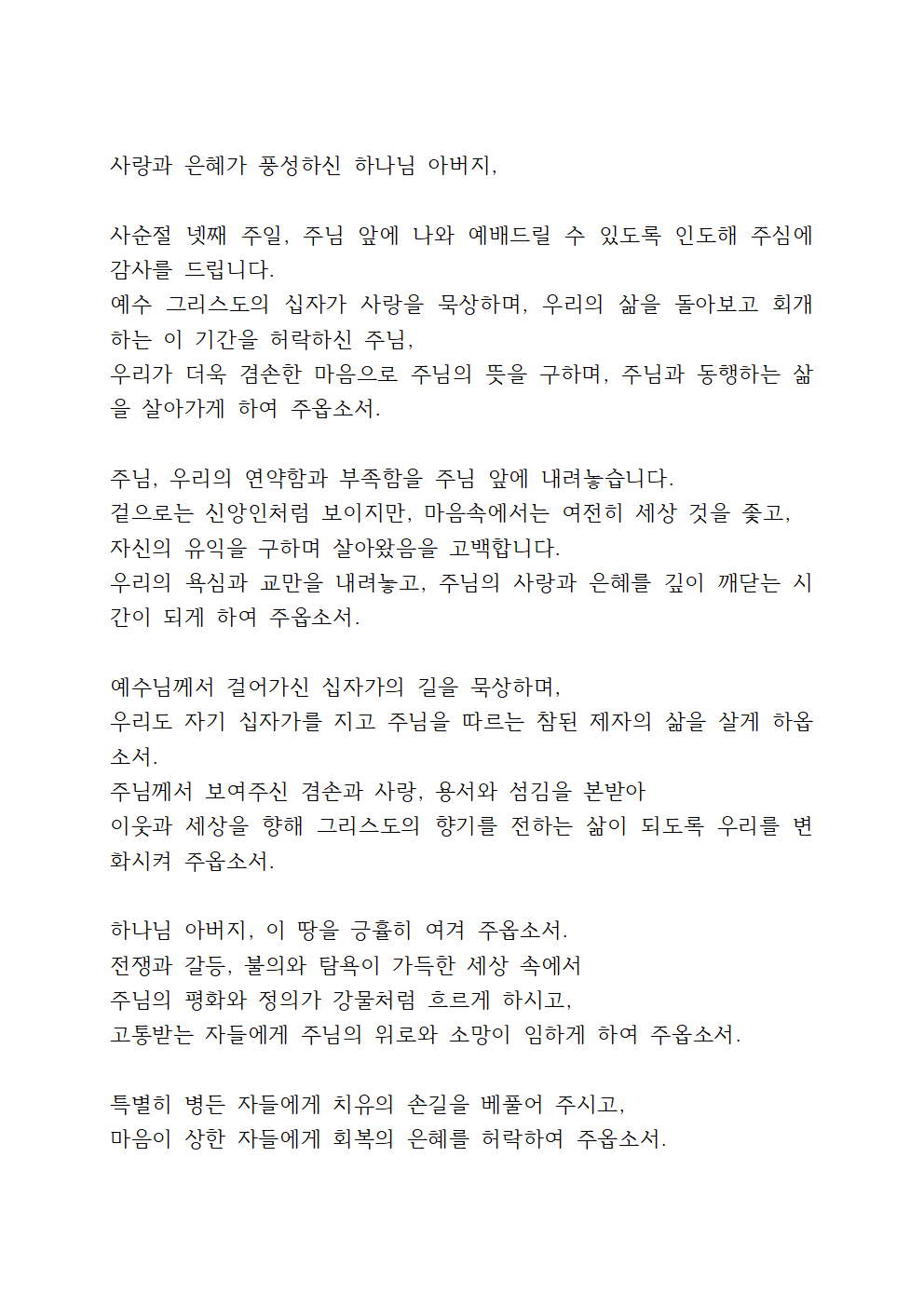 예수 그리스도의 십자가 사랑을 묵상하며, 우리의 삶을 돌아보고 회개하는 이 기간을 허락하신 주님,