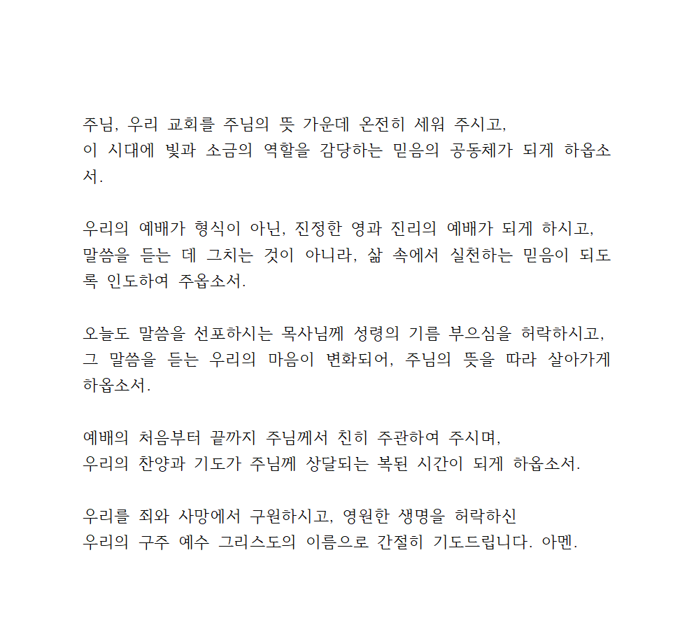 이번 글에서는 2025년 3월 넷째 주일 낮예배 대표기도문을 안내해 드리겠습니다.