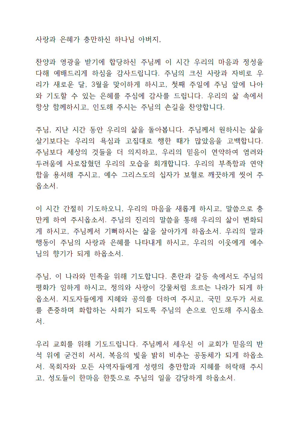 찬양과 영광을 받기에 합당하신 주님께 이 시간 우리의 마음과 정성을 다해 예배드리게 하심을 감사드립니다. 주님의 크신 사랑과 자비로 우리가 새로운 달, 3월을 맞이하게 하시고, 첫째 주일에 주님 앞에 나아와 기도할 수 있는 은혜를 주심에 감사를 드립니다. 우리의 삶 속에서 항상 함께하시고, 인도해 주시는 주님의 손길을 찬양합니다.