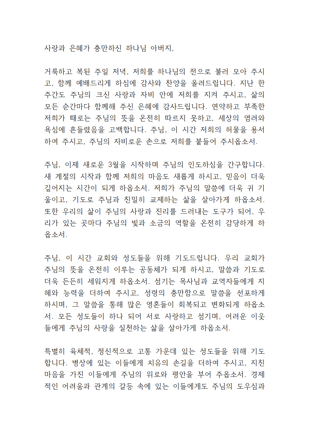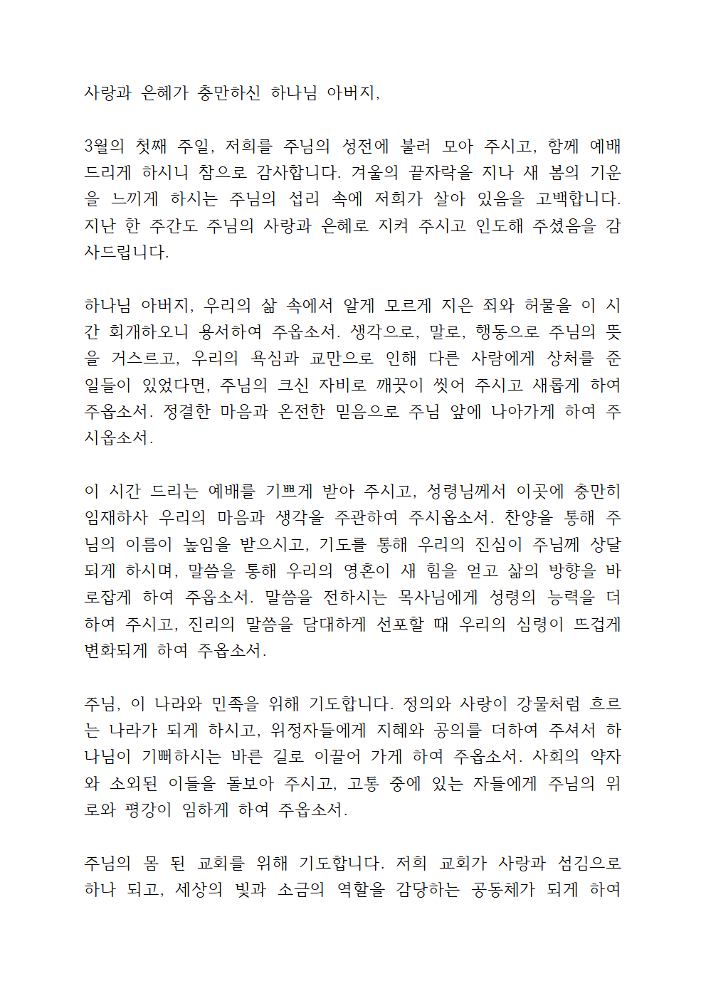 2025년 3월 첫째주일 대표기도문 모음 (세 가지 추가)