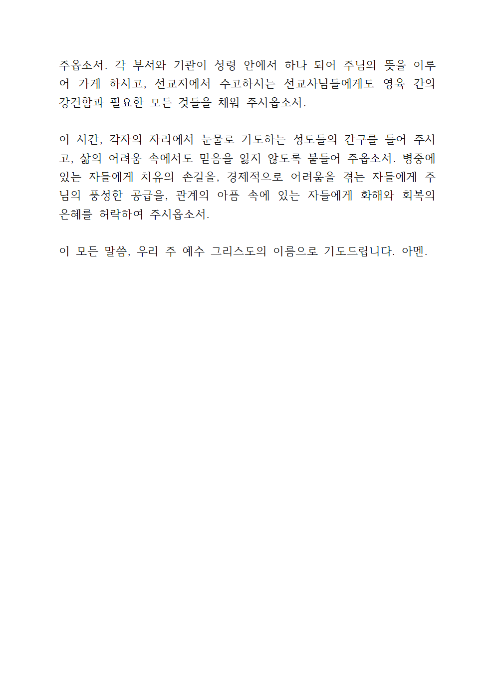 주님, 이 나라와 민족을 위해 기도합니다. 혼란과 갈등 속에서도 주님의 평화가 임하게 하시고, 정의와 사랑이 강물처럼 흐르는 나라가 되게 하옵소서. 지도자들에게 지혜와 공의를 더하여 주시고, 국민 모두가 서로를 존중하며 화합하는 사회가 되도록 주님의 손으로 인도해 주시옵소서.