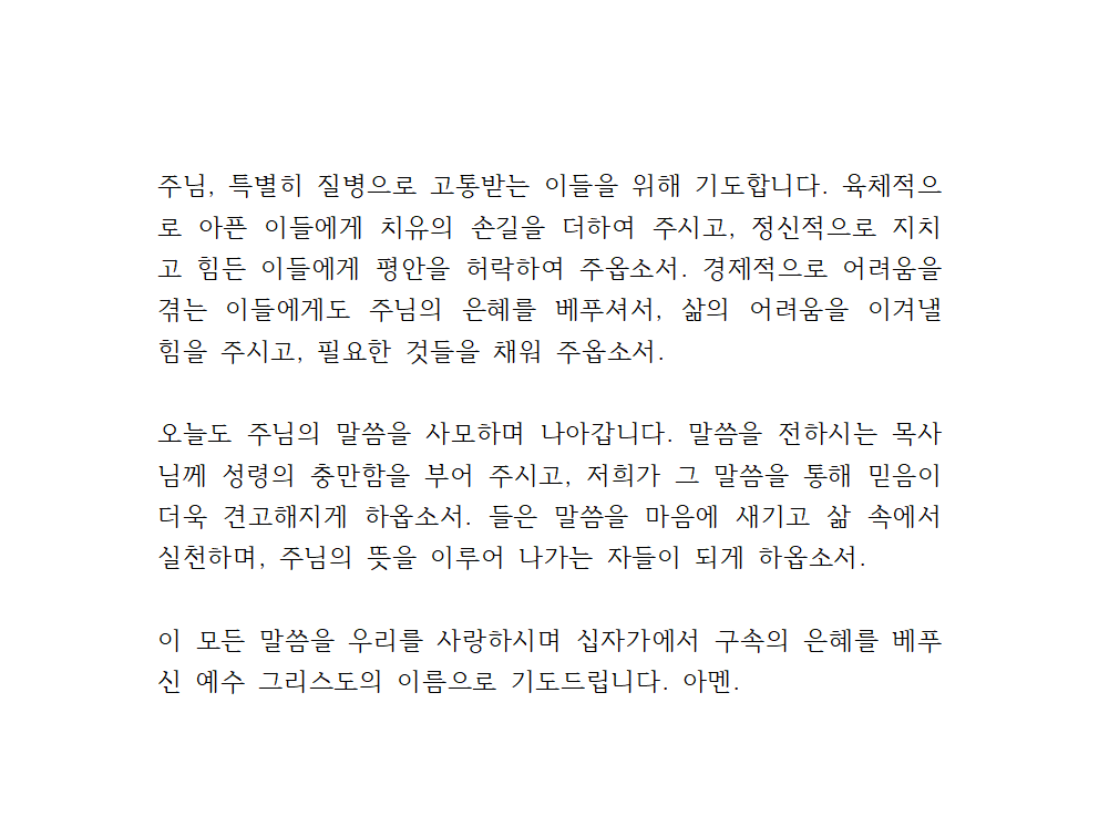 오늘도 주님의 말씀을 사모하며 나아갑니다. 말씀을 전하시는 목사님께 성령의 충만함을 부어 주시고, 저희가 그 말씀을 통해 믿음이 더욱 견고해지게 하옵소서. 들은 말씀을 마음에 새기고 삶 속에서 실천하며, 주님의 뜻을 이루어 나가는 자들이 되게 하옵소서.
