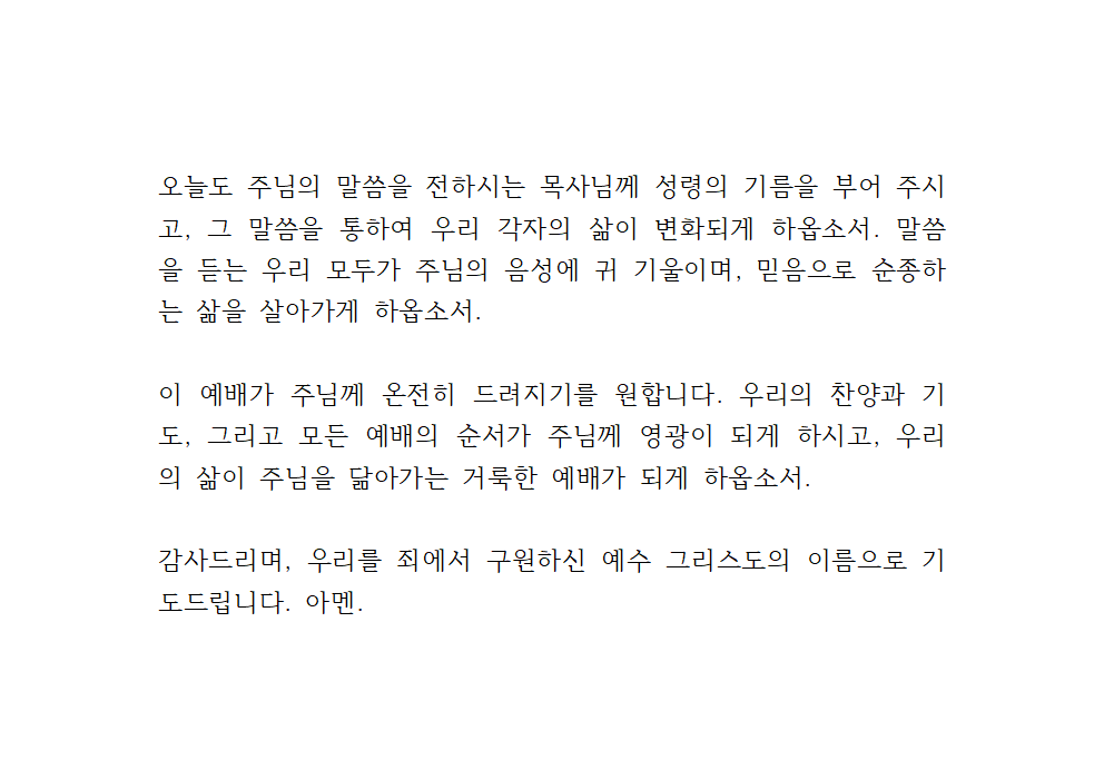 오늘도 주님의 말씀을 전하시는 목사님께 성령의 기름을 부어 주시고, 그 말씀을 통하여 우리 각자의 삶이 변화되게 하옵소서. 말씀을 듣는 우리 모두가 주님의 음성에 귀 기울이며, 믿음으로 순종하는 삶을 살아가게 하옵소서.