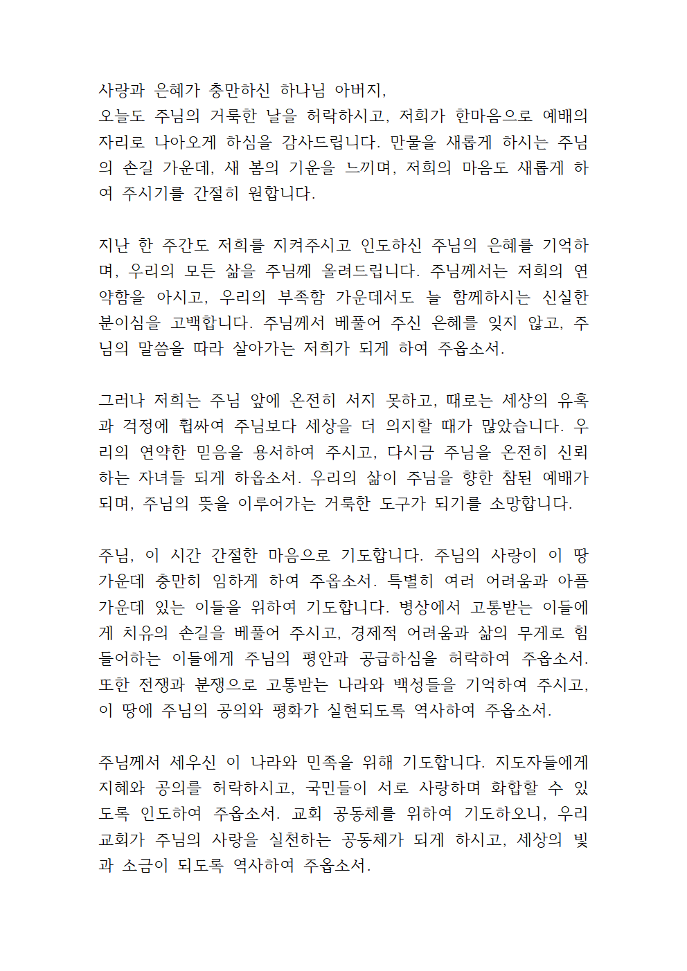 오늘도 주님의 거룩한 날을 허락하시고, 저희가 한마음으로 예배의 자리로 나아오게 하심을 감사드립니다. 만물을 새롭게 하시는 주님의 손길 가운데, 새 봄의 기운을 느끼며, 저희의 마음도 새롭게 하여 주시기를 간절히 원합니다.
