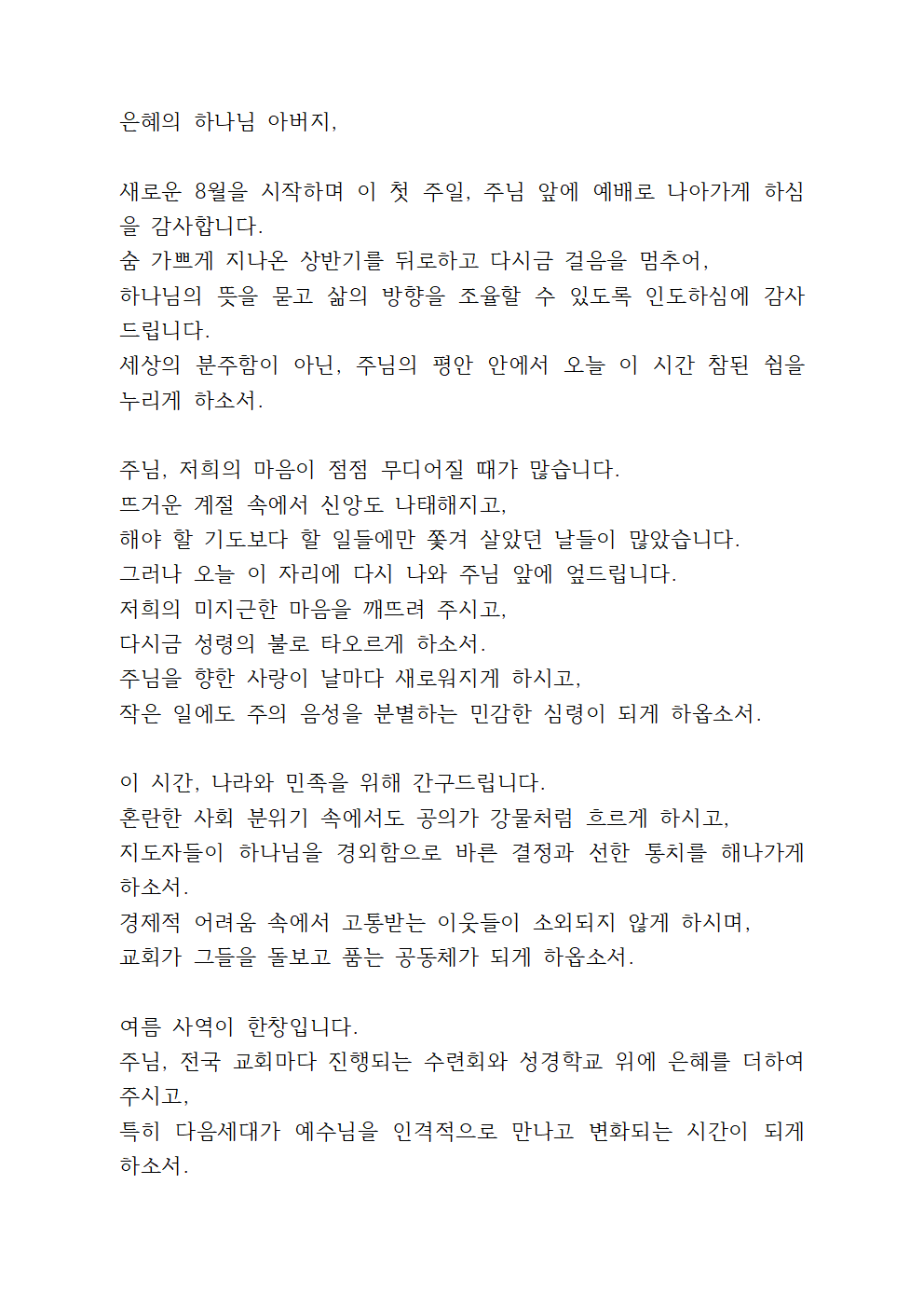 이번 글에서는 2025년 8월 첫째주일예배 대표기도문을 안내해 드리겠습니다.