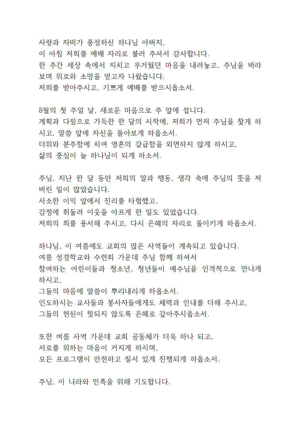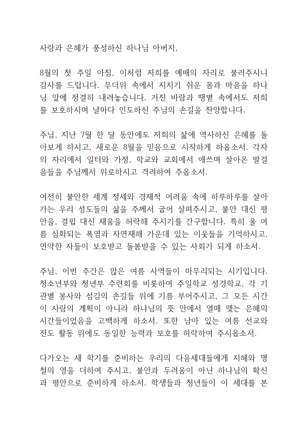 '2025년 8월 첫째주일예배 대표기도문'