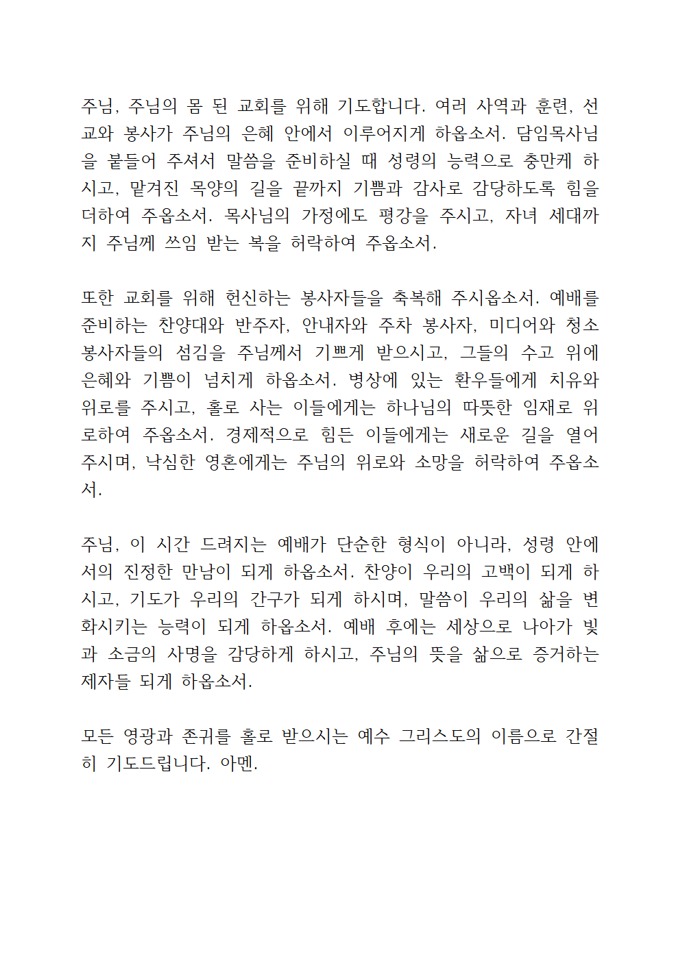 오늘 드려지는 예배 가운데 성령께서 충만히 임재하시기를 원합니다. 말씀을 선포하시는 목사님께 권능을 더하시고, 그 말씀을 듣는 저희 마음밭이 옥토가 되어 풍성한 열매 맺게 하옵소서. 찬양과 기도, 헌신이 주님께 향기로운 제물이 되게 하시며, 예배 이후의 삶이 곧 예배가 되게 하여 주옵소서.