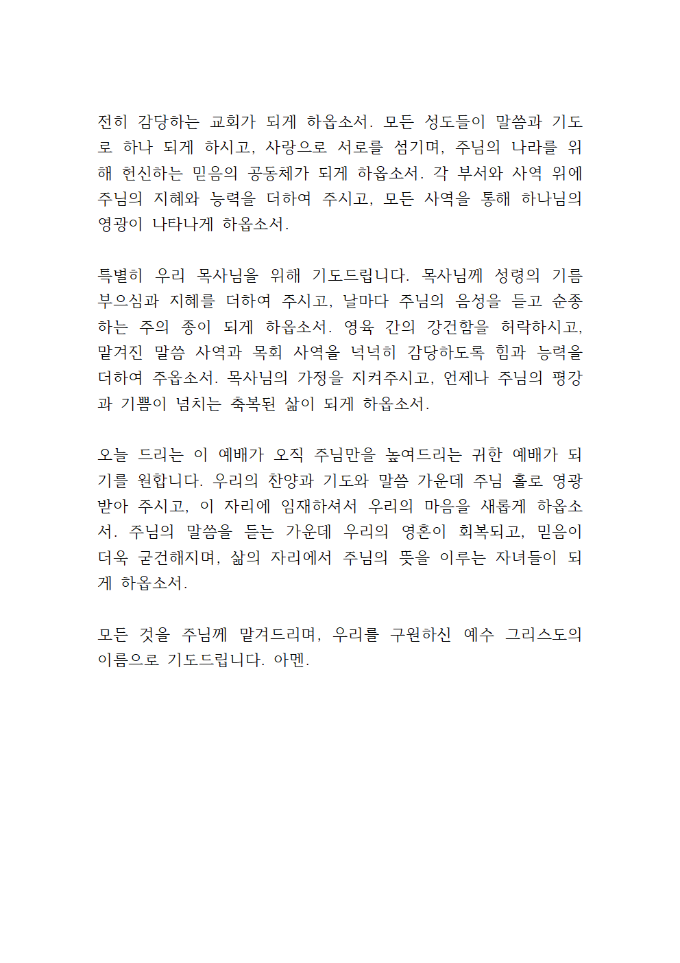 특별히 우리 교회를 위해 기도합니다. 주님께서 세우신 이 교회가 말씀 위에 굳게 서게 하시고, 사랑과 나눔이 넘치는 공동체가 되게 하옵소서. 모든 성도들이 한마음으로 주님의 뜻을 구하고 실천하며, 주님의 복음을 전하는 일에 힘쓰게 하옵소서. 다음 세대들을 축복하시고, 우리의 자녀들이 믿음 안에서 바르게 성장하게 하옵소서.