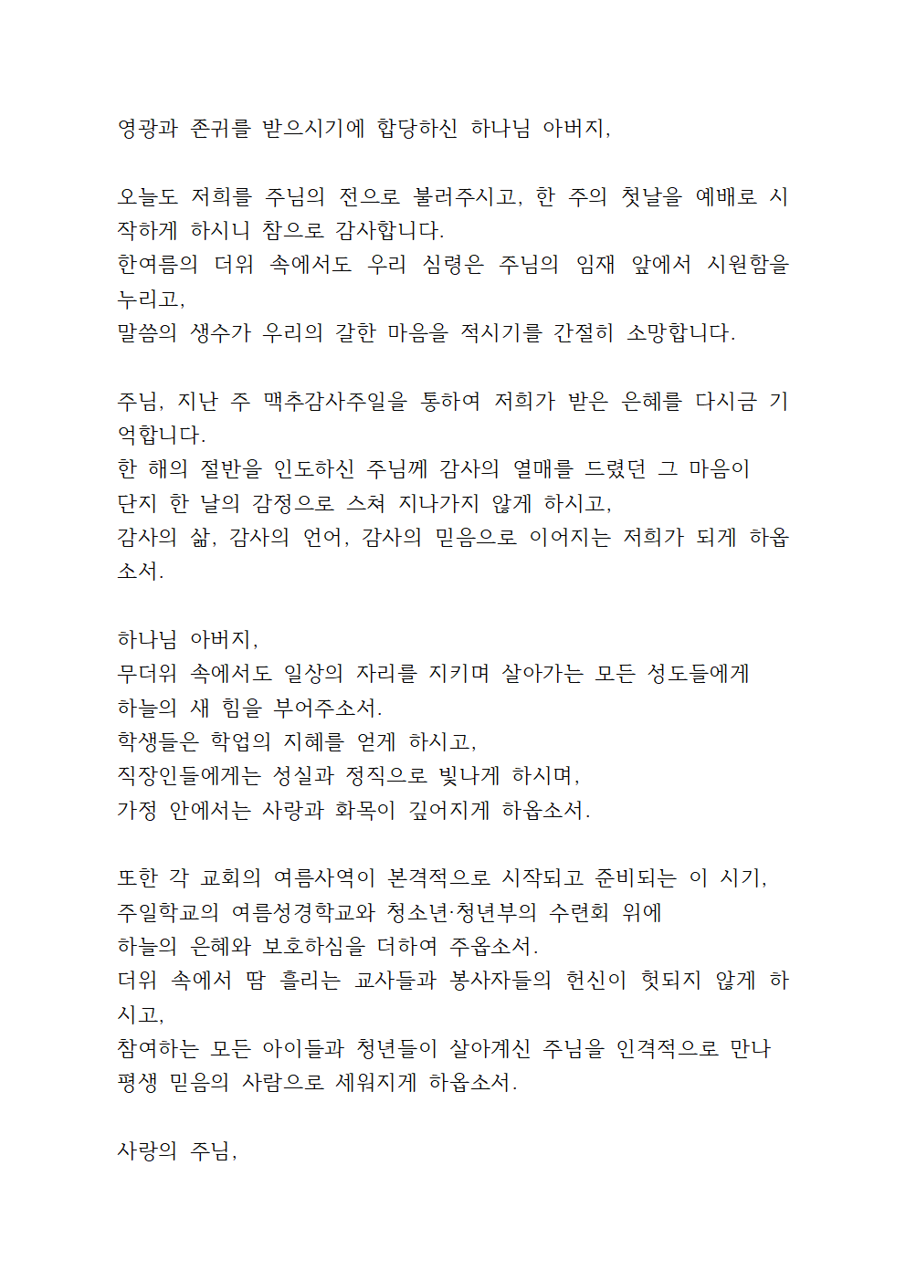 '7월 둘째주일예배 대표기도문'